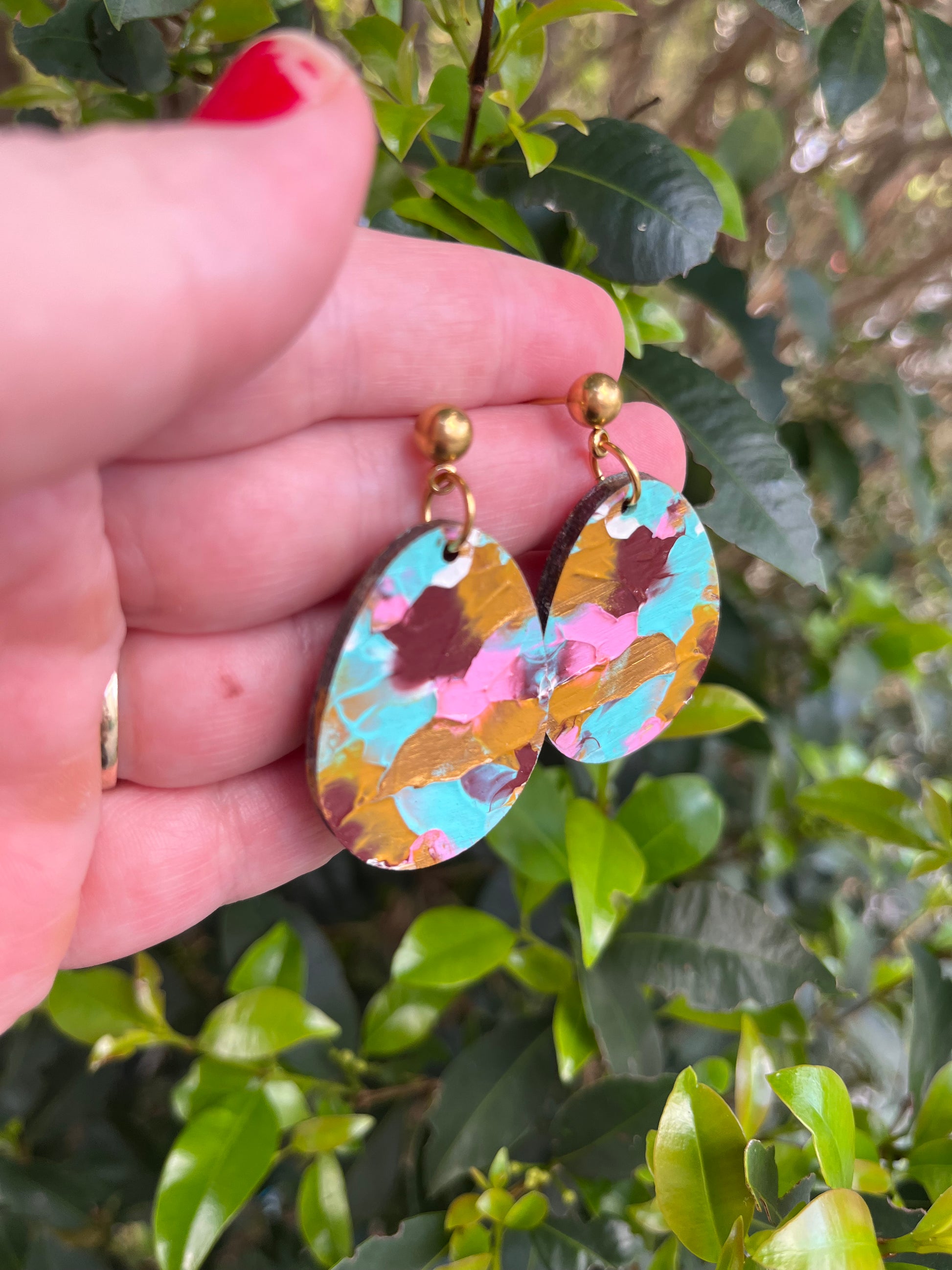 They are painted in acrylic paint and finished with a glossy varnish sealant! The back of the earring is not painted.. They have a unique textured look to them! 😍💕