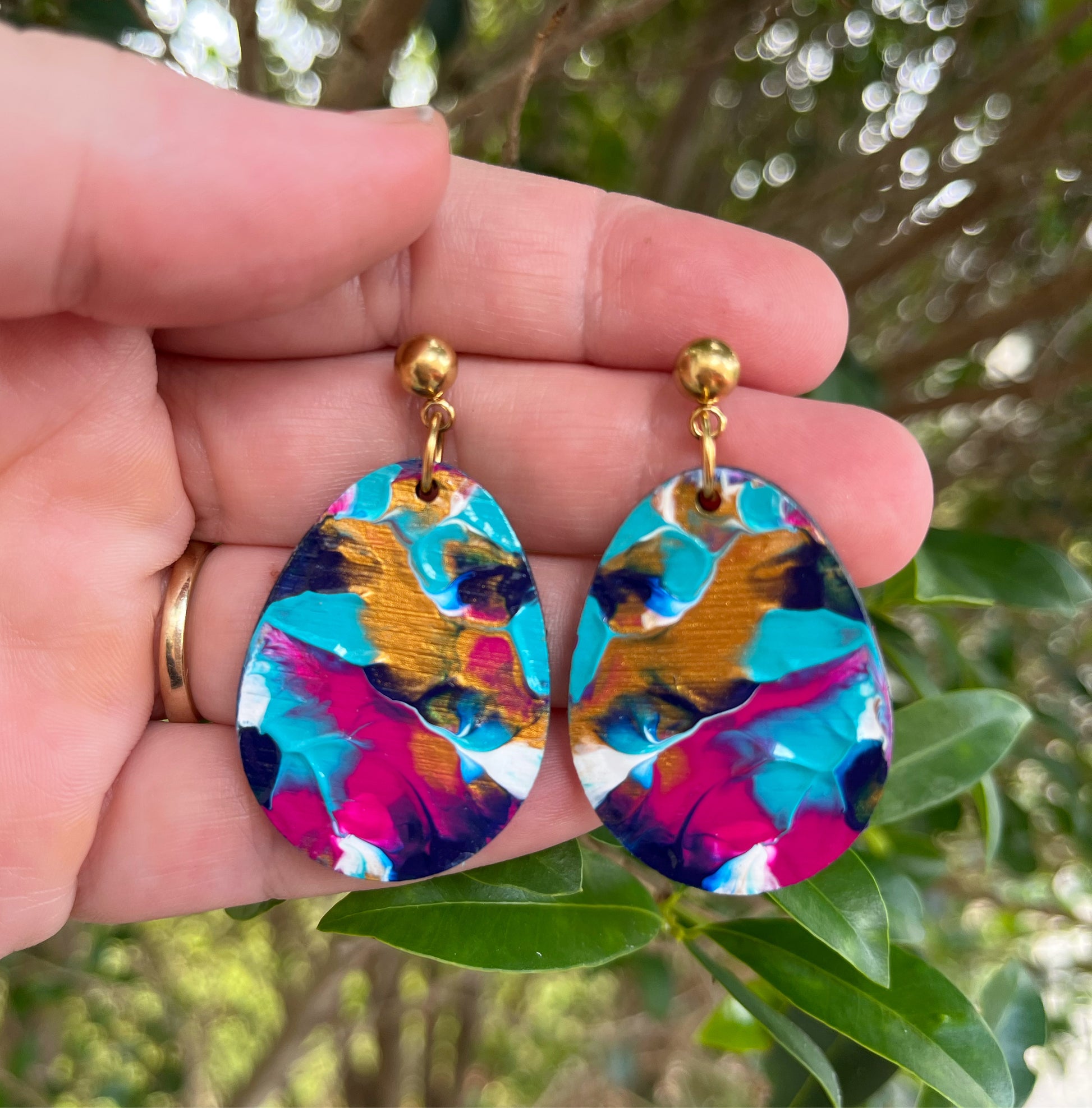 They are painted in acrylic paint and finished with a glossy varnish sealant! The back of the earring is not painted.. They have a unique textured look to them! ๐๐
