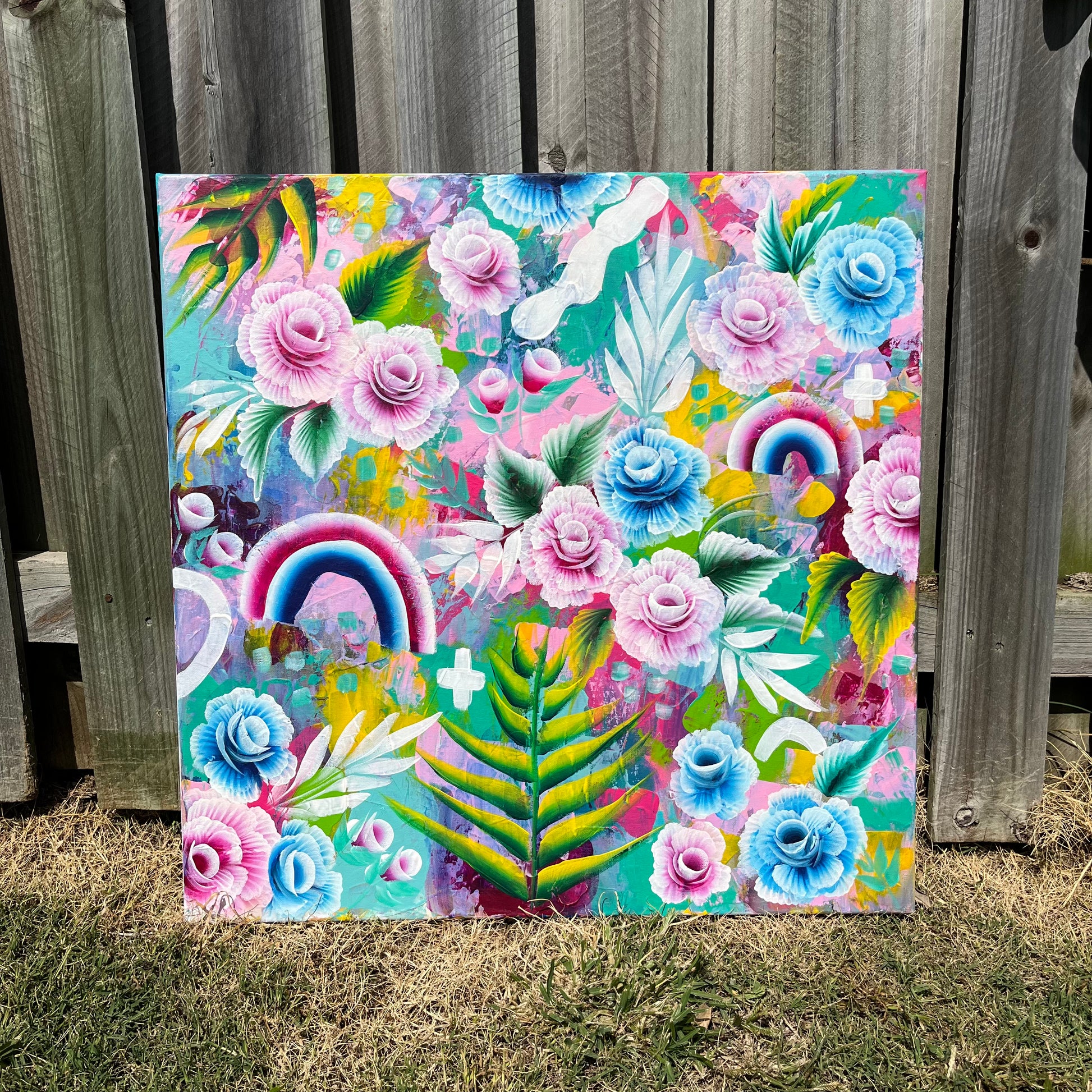 Handpainted original art, acrylic on canvas! onestroke florals with a mixed colourful abstract shapes background.. This artwork has some rough textures in the background and is not completely smooth and it’s exactly how I love to paint! I love using a mix of mediums in my background..