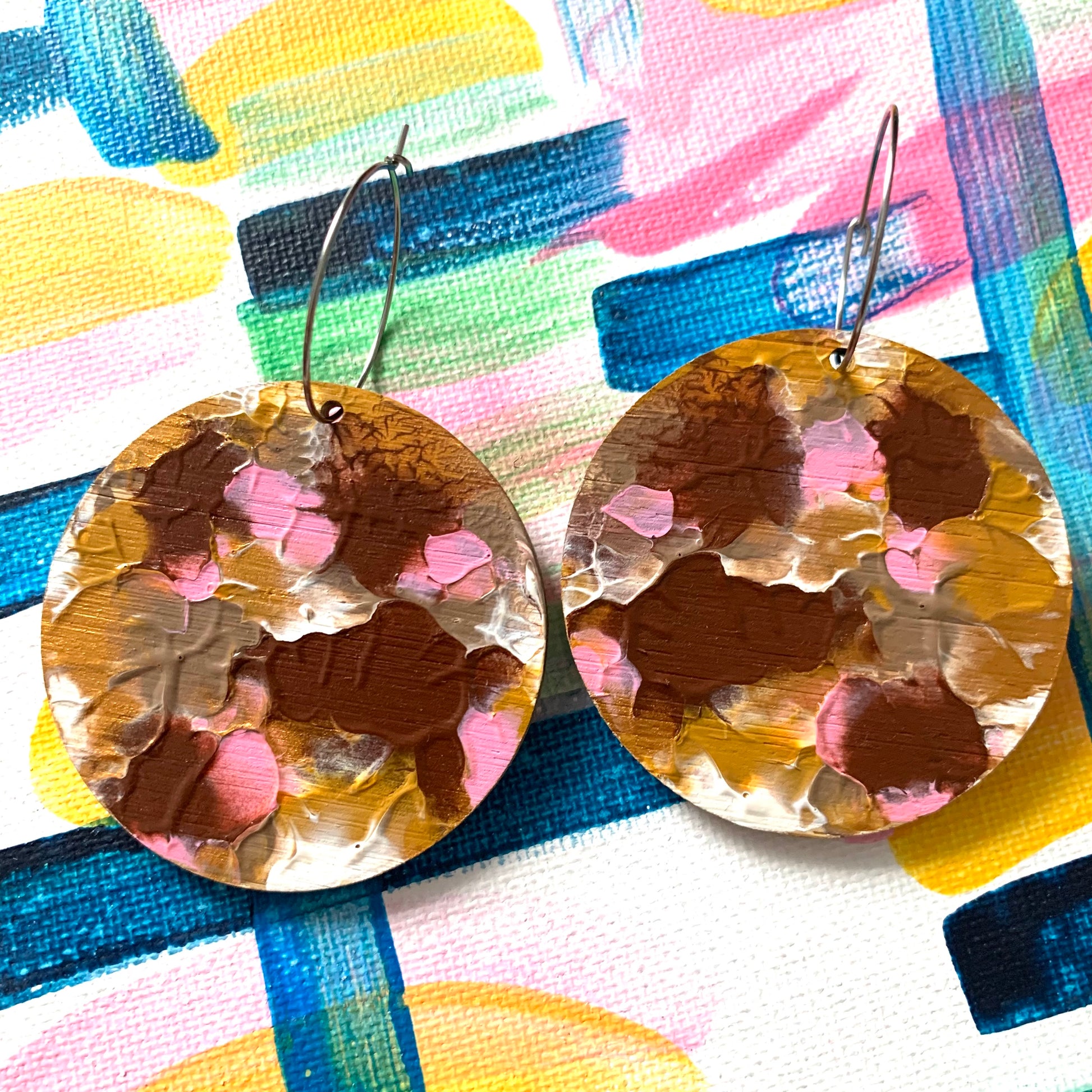 Hey there, So these colourful unique earrings are Handpainted on wooden bamboo discs, This is just an example of the colours you will receive on your original art earrings! Please be aware that each and every pair are truly unique and Can not be replicated, this is due to the technique I use to paint them! 💕❤️ Absolutely no one else in the world will have your earrings! They are painted in colour combos but bringing you a truly unique pair every time 💕