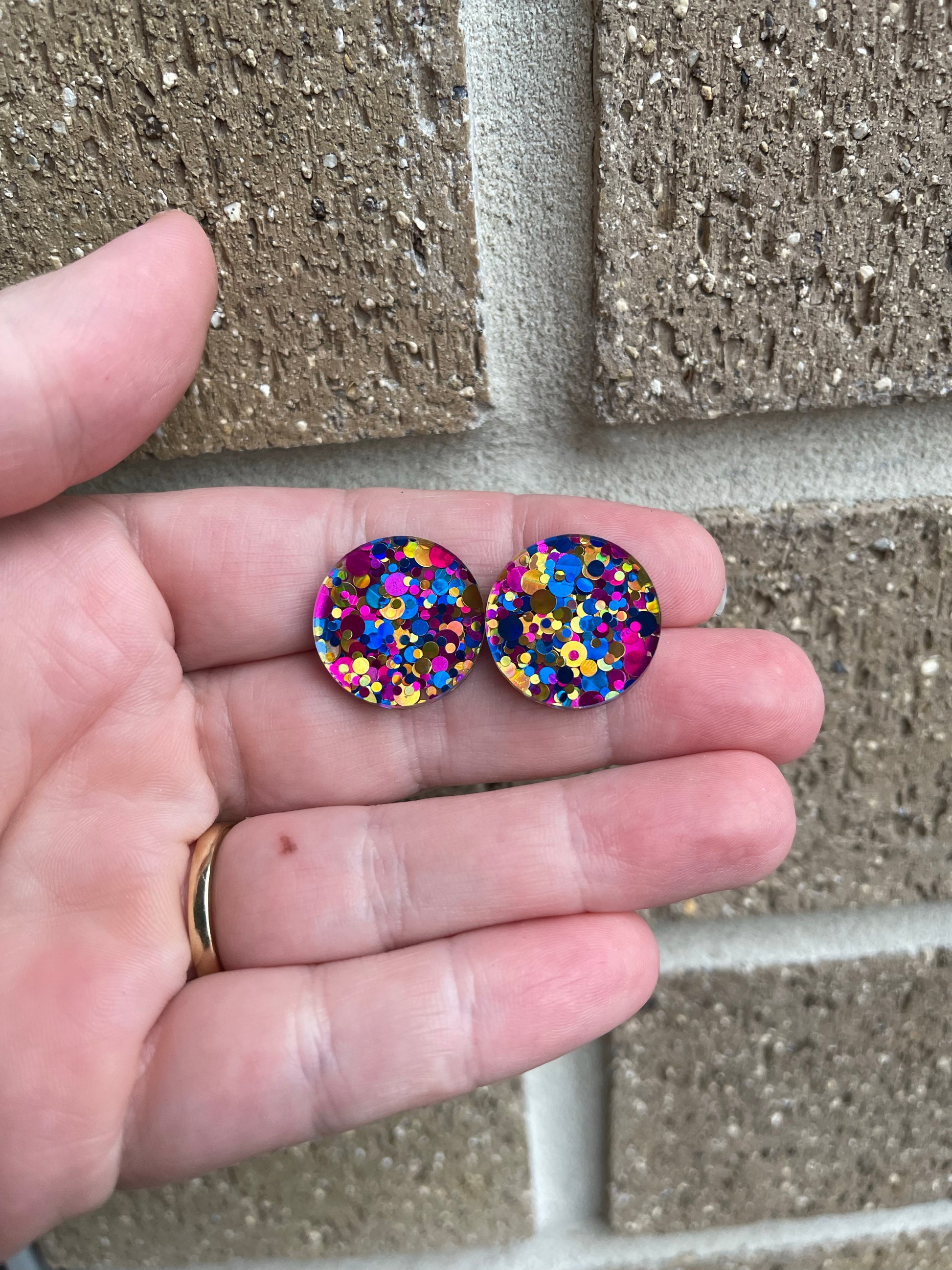 Image is just an example of a pair you will receive, due to the nature in which these are made colours, glitters or foils placement will be different, some may have gaps in which will be clear, unfortunately that’s the nature of acrylic sheeting, but I assure you that you will love them!. Some may even show the stud coming through from behind.